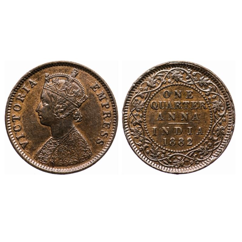 | Victoria Empress, Copper, Quarter Anna, 1882, Calcutta Mint, B/II, no mint mark, 'C' incused, multiple die crack error on obverse. GK 835. |