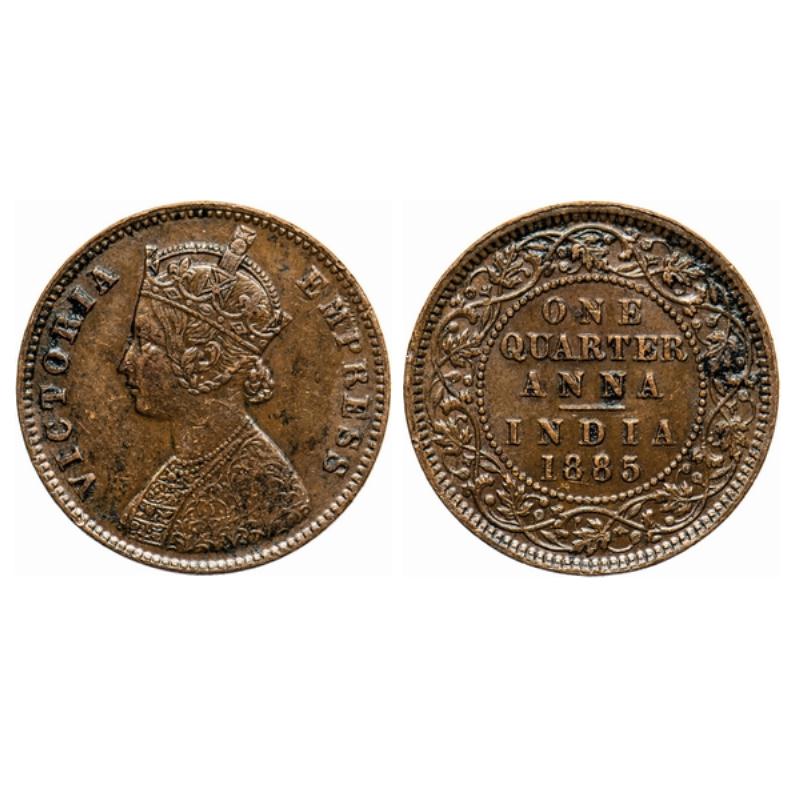 Victoria Empress, Copper, Quarter Anna, 1885, Calcutta Mint, B/II, 'C' incused, no mint mark. GK 840.