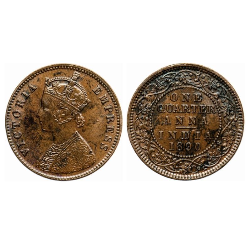 | Victoria Empress, Copper, Quarter Anna, 1890, Calcutta Mint, B/II, no mint mark, Ghost on reverse, die crack on obverse. GK 849. |