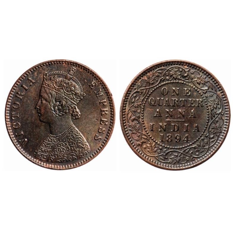 Victoria Empress, Copper, Quarter Anna, 1894, Calcutta Mint, B/II, no mint mark, Ghost on reverse. ...