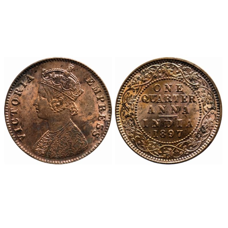Victoria Empress, Copper, Quarter Anna, 1897, Calcutta Mint, B/II, no mint mark. GK 856.