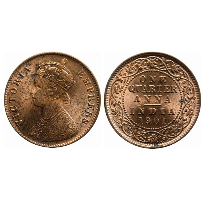 Victoria Empress, Copper, Quarter Anna, 1901, Calcutta Mint, B/II, no mint mark. Ghost on Rev. GK 860.