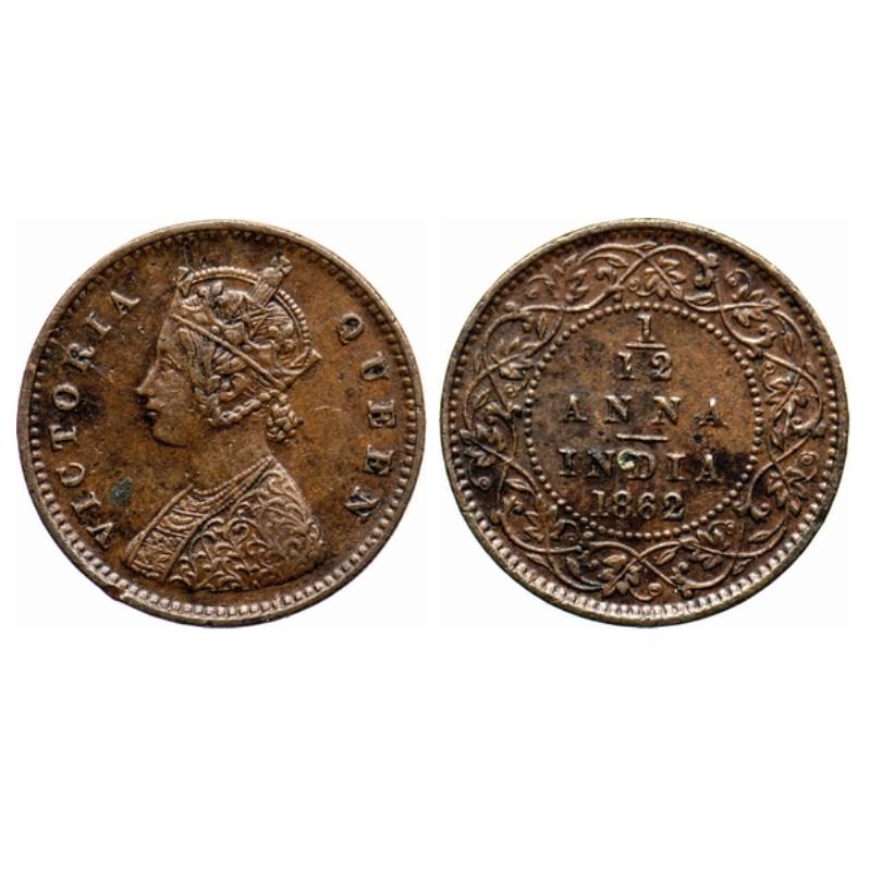 Victoria Queen, Copper, 1/12 Anna, 1862, Madras Mint, A/I. GK 405.