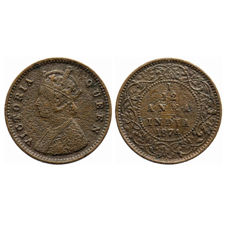 Victoria Queen, Copper, 1/12 Anna, 1874, Calcutta Mint, Obv A, No mint mark.GK 882.
