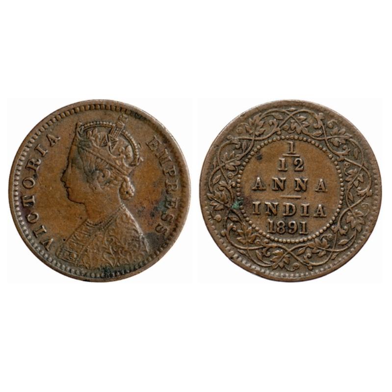 Victoria Empress, Copper, 1/12 Anna, 1891, Calcutta Mint, Obv. B, No mint mark. GK 912.