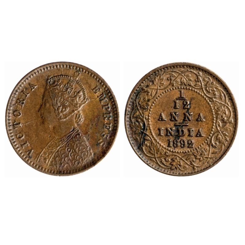 | Victoria Empress, Copper, 1/12 Anna, 1892, Calcutta Mint, Obv. B, No mint mark, Ghost on Reverse, Multiple die crack on obverse. GK 913. |