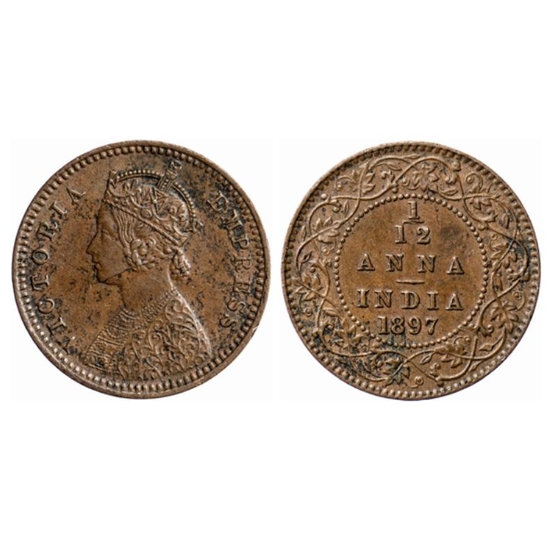 Victoria Empress, Copper, 1/12 Anna, 1897, Calcutta Mint, Obv. B, No mint mark. Planchet flaw on Obverse, Die crack on Obverse. GK 918.