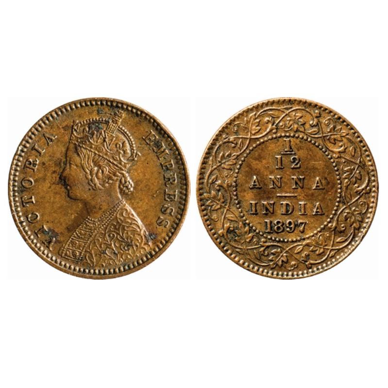 Victoria Empress, Copper, 1/12 Anna, 1897, Calcutta Mint, Obv B, No mint mark, Double lettering on ...
