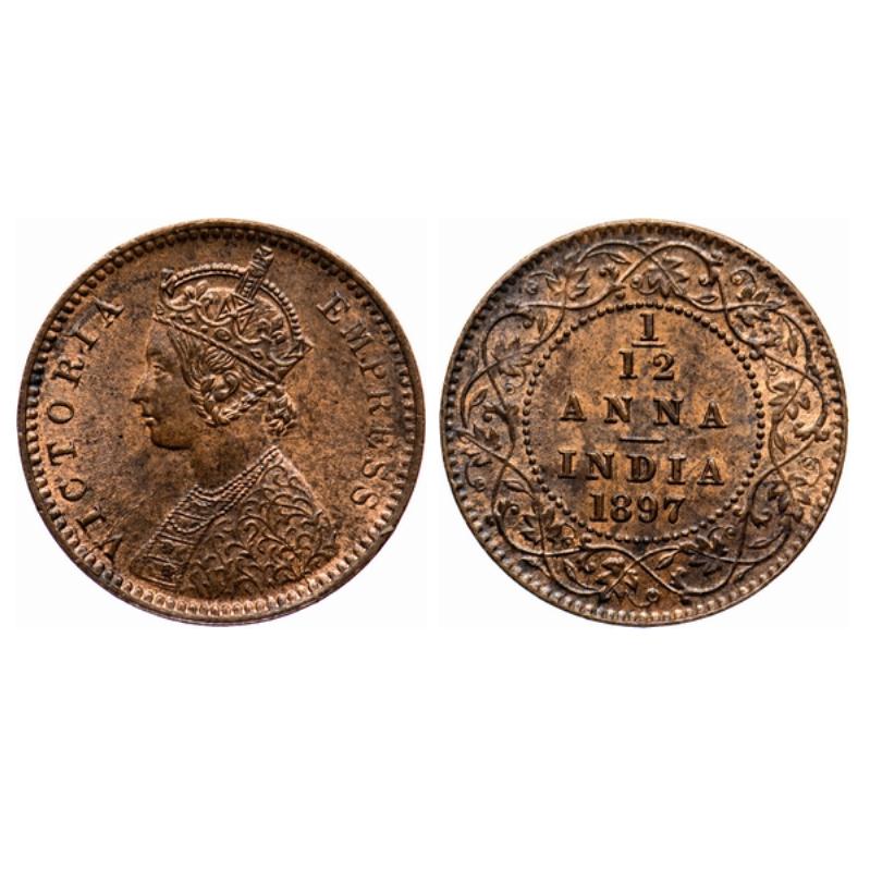| Victoria Empress, Copper, 1/12 Anna, 1897, Calcutta Mint, Obv. B, No mint mark, Die crack on Obverse, 'B' & 'R' of Empress are broken. GK 918. |