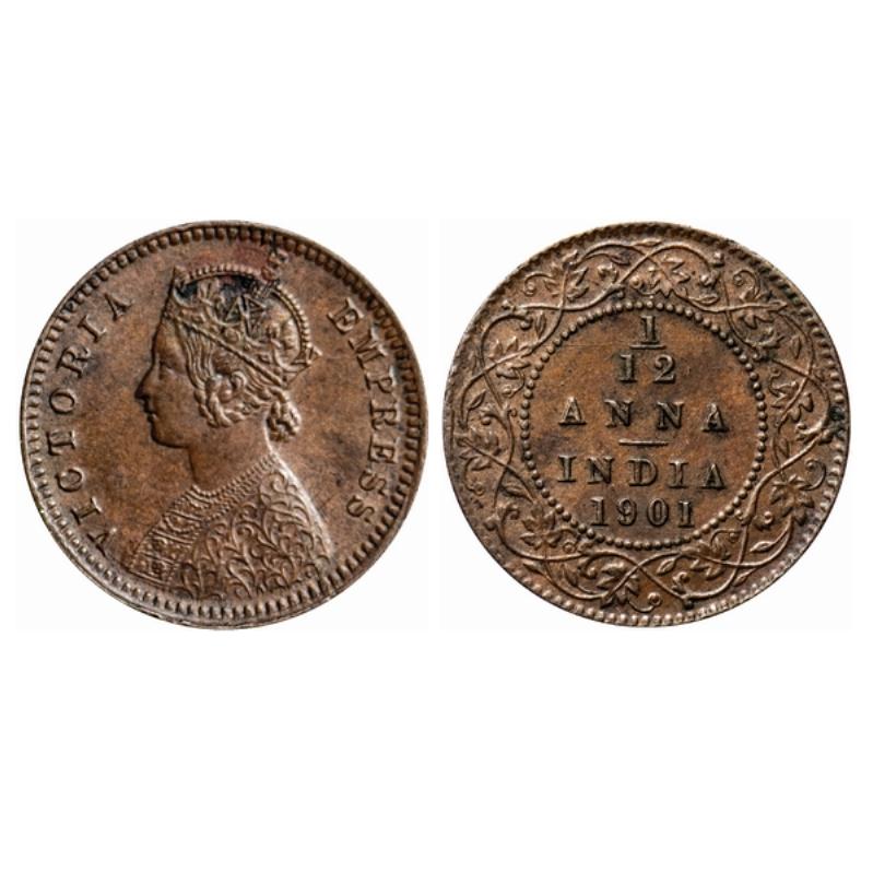 Victoria Empress, Copper, 1/12 Anna, 1901, Calcutta Mint, Obv. B, No mint mark. GK 921. ...