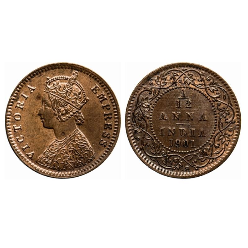 | Victoria Empress, Copper, 1/12 Anna, 1901, Calcutta Mint, Obv. B, No mint mark, Double impression of lower chin, Crudish lettering of Empress. GK 921. |