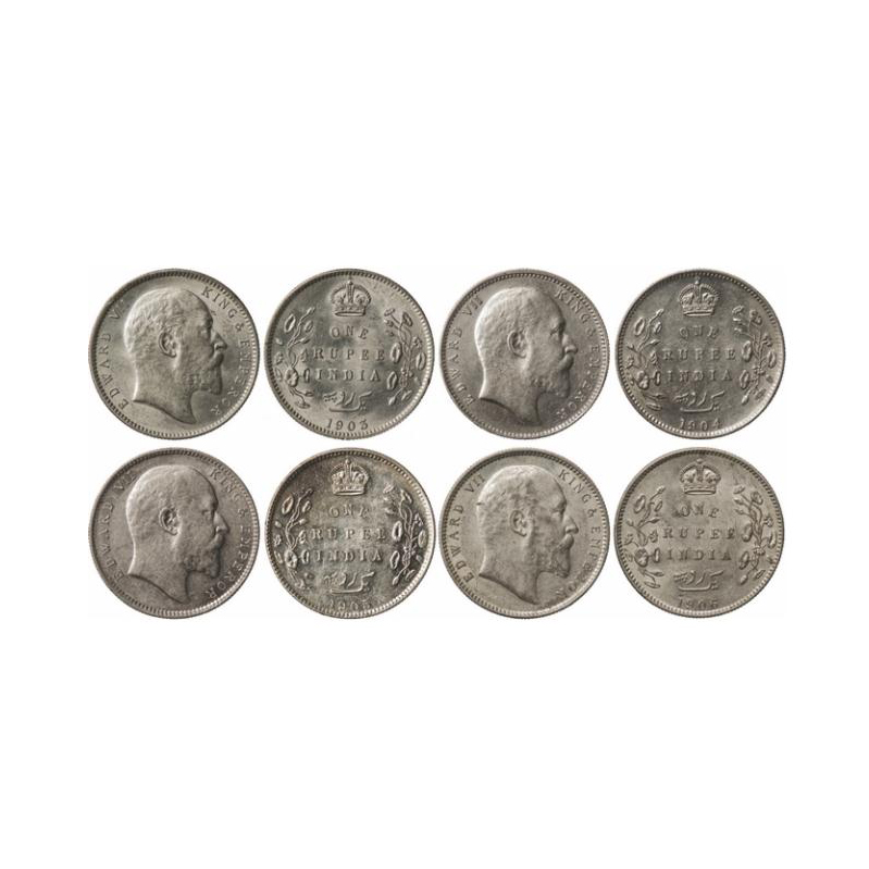 | Edward VII, Silver, Rupee (4 Coins), 1903 (Cal) no mint mark, 1904 (Bom) 'B' incused, dot, numeral '4' long, 1905 (Bom) 'B' incused, dot, numeral '5' long, 1906 (Cal) no mint mark. GK 924, 933, 936, 938. |