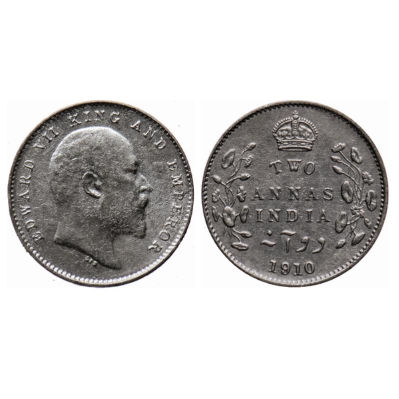 Edward VII, Silver, 2 Annas, 1910, Calcutta Mint, No mint mark, Letter R of Edward is broken. GK 987.