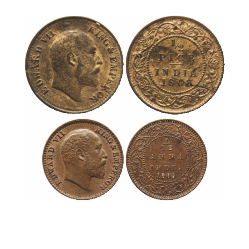 | Edward VII, Bronze, ½ Pice (2 Coins), 1908, Calcutta Mint, No mint mark, Planchet flaw on Reverse, 1/12 Copper, 1905, Calcutta Mint, No mint mark. GK 1009, 1014. |