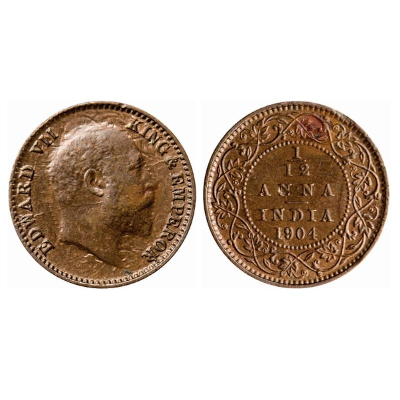 Edward VII, Copper, 1/12 Anna, 1904, Calcutta Mint, No mint mark, Ghost on Obverse. GK 1013. ...