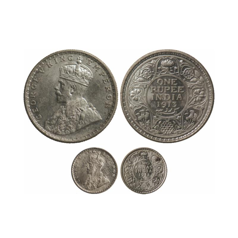 | George V, Silver, Rupee & 2 Annas (2 Coins), 1913, Rupee, Bombay Mint, Dot, 2 Annas Calcutta Mint, No dot. GK 1028, 1110. |