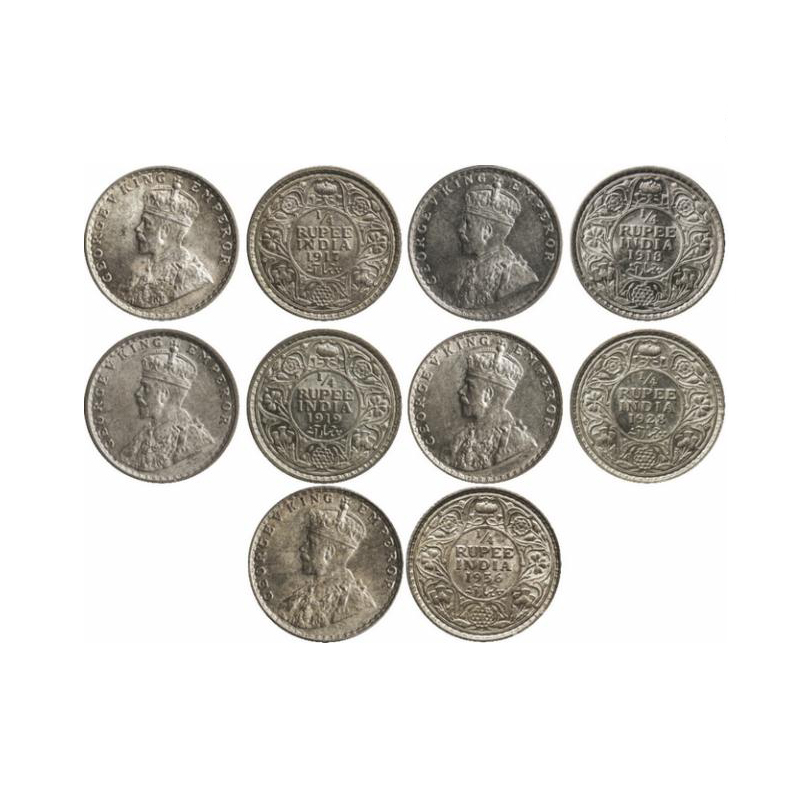 | George V, Silver, 1/4 Rupee (5 Coins), 1917 Calcutta Mint, No dot, Ghost on Obv, 1918 Calcutta Mint, No dot, 1919 Calcutta Mint, No dot, 1928 Bombay Mint, Dot, 1936 Bombay Mint, Dot. GK 1090, 1091, 1092, 1095, 1100. |