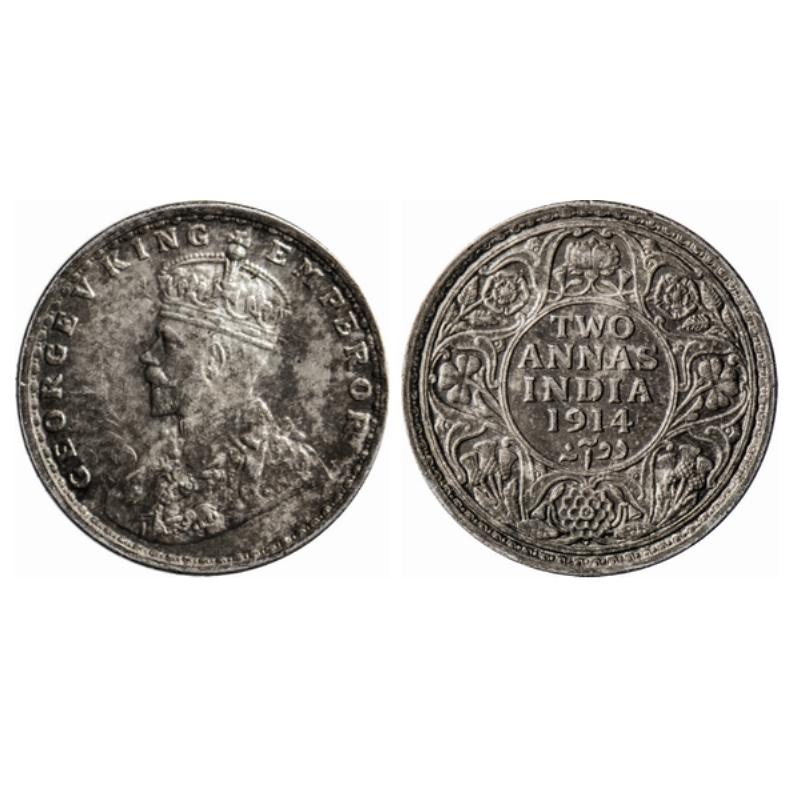 George V, Silver, 2 Annas, 1914, Bombay Mint, Ghost on Obv & Rev, Die crack on Obv. GK 1113.