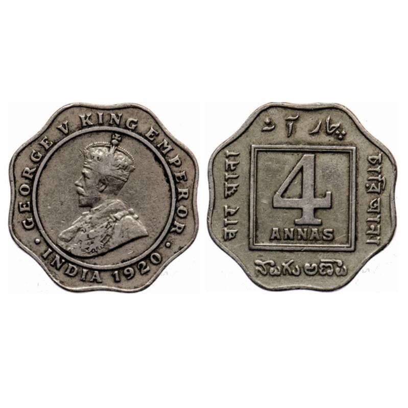 George V, Copper-Nickel, 4 Annas, 1920, Calcutta Mint, No Dot. GK 1103.