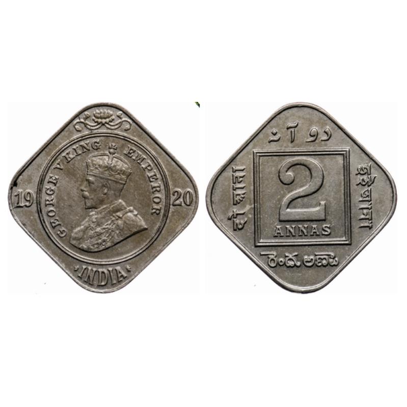 | George V, Copper Nickel, 2 Annas, 1920, Calcutta Mint, No dot, the diameter of coin is 21.15 while normal diameter is always 21.40 diagonolly 25.30 which is standard, the weight is standard 5.83gm, multiple die cracks on obverse. GK 1121. |