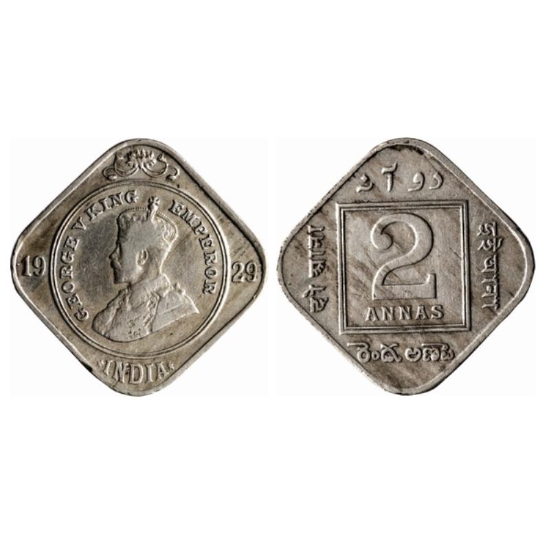 George V, Copper-Nickel, 2 Annas, 1929, Calcutta Mint, No dot. GK 1134.