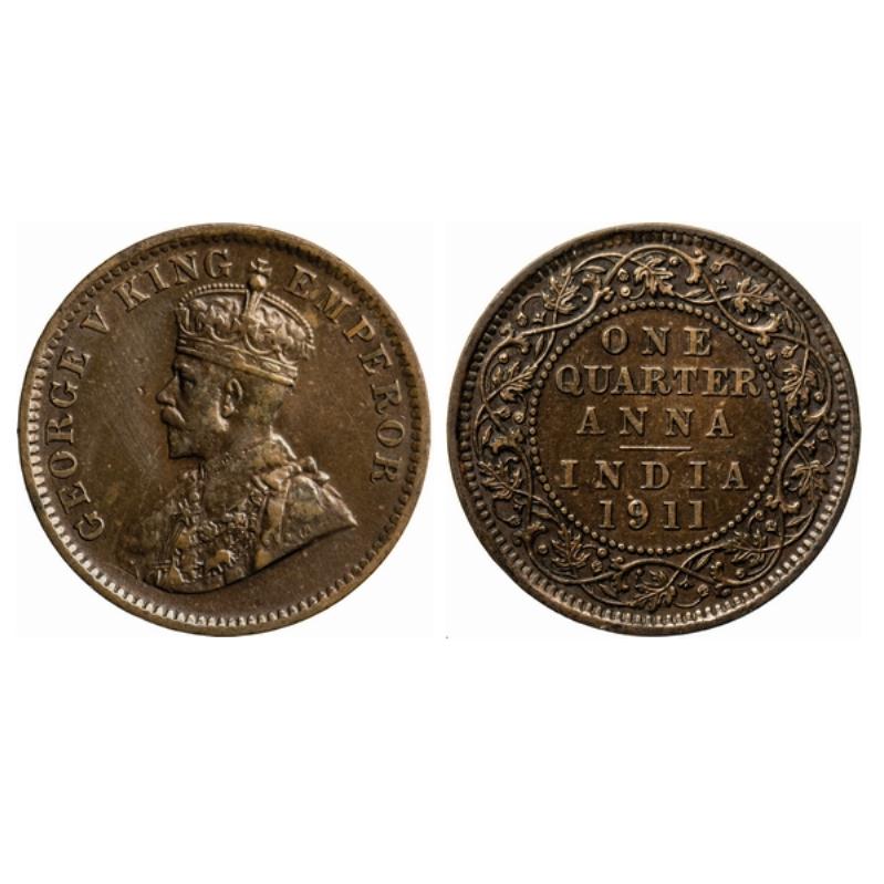 George V, Bronze, Quarter Anna, 1911, Calcutta Mint, No dot, Pig type, Ghost on Reverse. GK 1171.