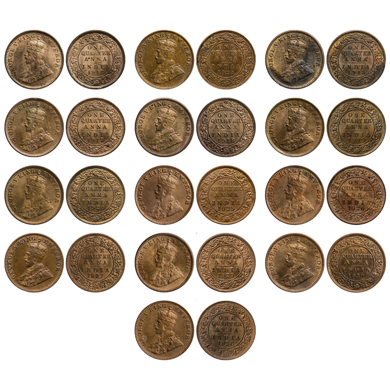 | George V, Bronze, Quarter Anna (13 Coins), 1912 (Cal), 1913 (Cal), 1917 (Cal), 1918 (Cal), 1919 (Cal), 1920 (Cal), 1924 (Bom), 1925 (Bom), 1926 (Bom), 1927 (Bom), 1929 (Cal), 1930 (Cal), 1936 (Bom). GK 1172, 1173, 1176, 1177, 1178, 1179, 1180, 1181, 1183, |