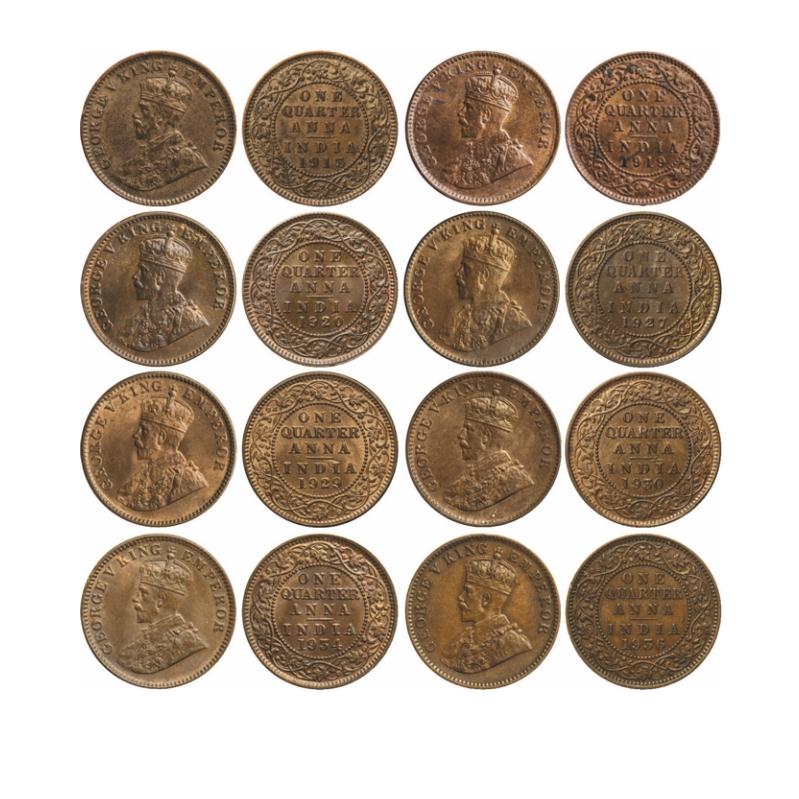 George V, Bronze, Quarter Anna (10 Coins), 1912, 1913, 1917, 1920, 1929, 1933, 1934, 1936, Calcutta...
