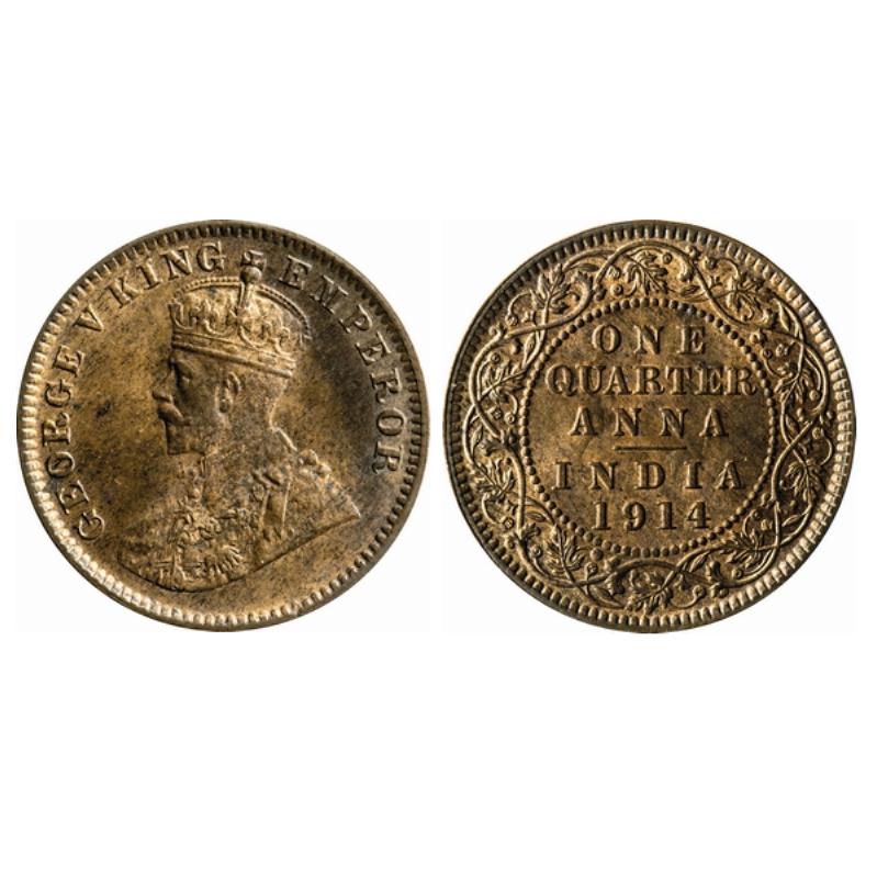 George V, Bronze, Quarter Anna, 1914, Calcutta Mint, No dot. GK 1174.