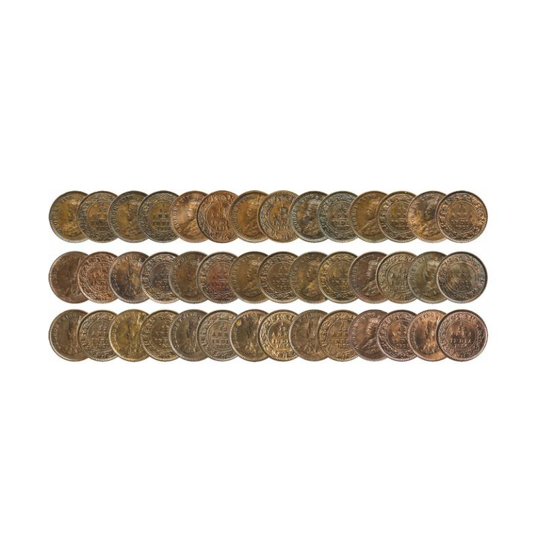 | George V, Bronze, 1/12 Anna (21 Coins), 1912 Bombay Mint Planchat flaw on Obverse, 1914 Bombay Mint Ghost on Reverse, 1915 Bombay Mint, 1916 Bombay MInt, 1917 Bombay Mint, 1920 Bombay Mint Die crack on Obverse, 1923 Bombay Mint, 1924 Bombay Mint, 1925 Bom |