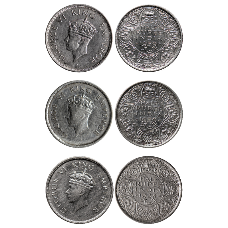 | George VI, Silver, ½ Rupee (3 Coins), 1938 Bombay Mint, Head type I, A/I, dot, 1939, Bombay Mint, Head type I, A/I, Dot, 1939 Calcutta Mint, Head type II, A(a)/I, No dot. GK 1294, 1295, 1298. |