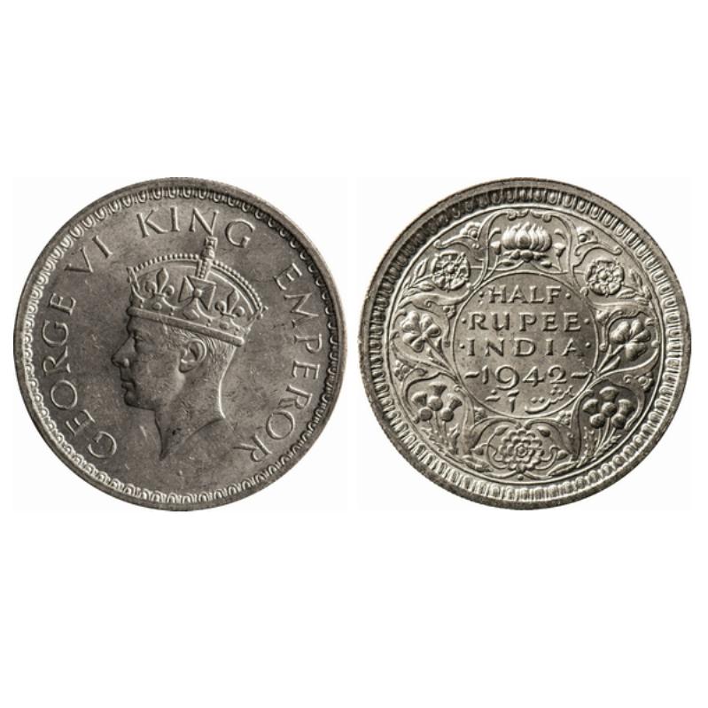 George VI, Half Silver, ½ Rupee, 1942, Bombay Mint, Head type II, B/II, Dot, Security edge, 2'o clo...