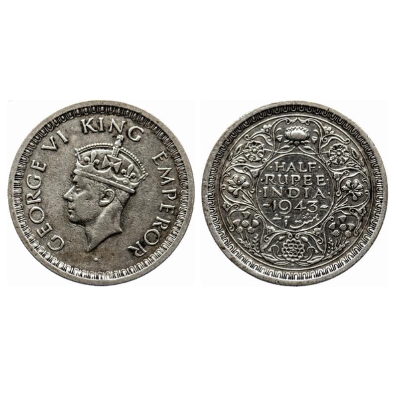 George VI, Silver, ½ Rupee, 1943, Bombay Mint, Head Type II, B/III. Security edge. GK 1306.