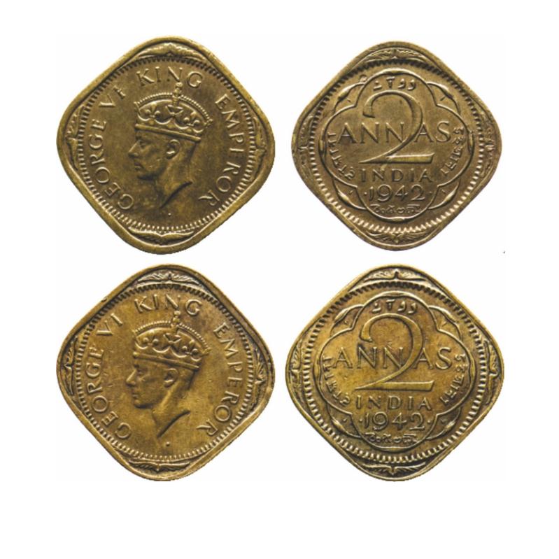 | George VI, Brass Nickle, 2 Annas (2 Coins), 1942, Bombay Mint, Head Type II, Dots by year, Large 4, Small 4. GK 1359, 1358. |