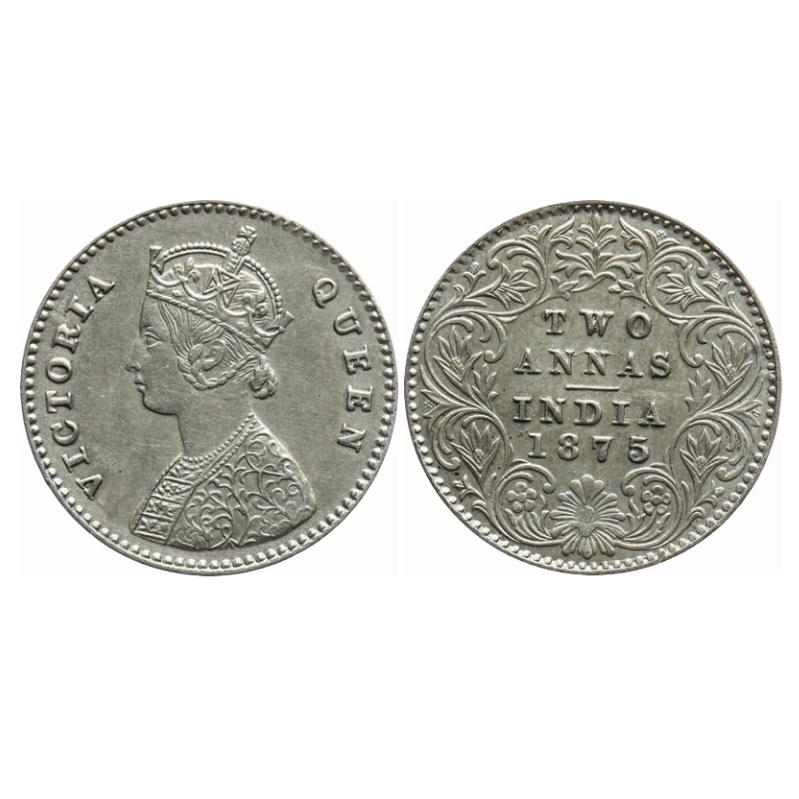 Victoria Queen, Silver, 2 Annas, 1875, Calcutta Mint, A/I, No mint mark, Ghost on rev. GK 742. About Uncirculated. Rare.
