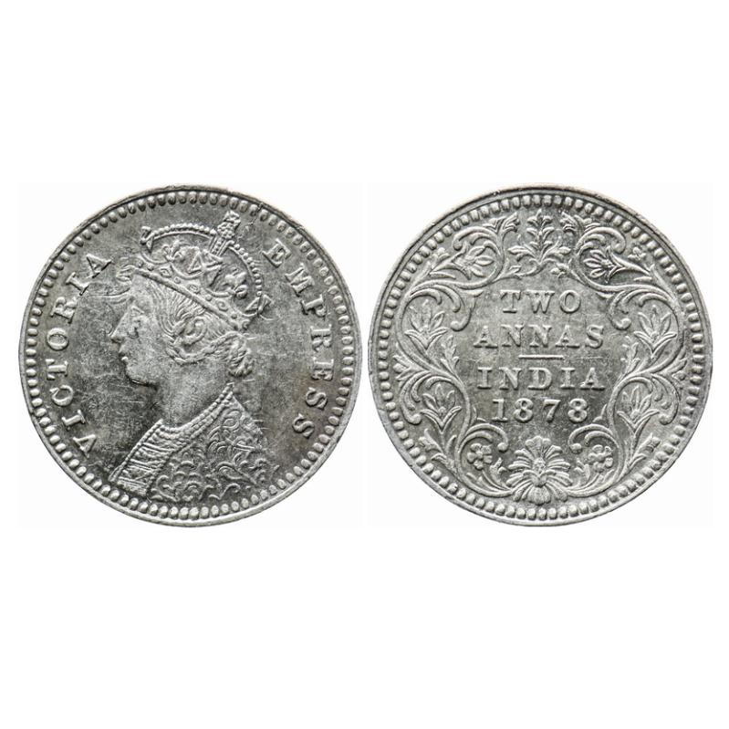 Victoria Empress, Silver, 2 Annas, 1878, Calcutta Mint, B/II, No mint mark, Ghost on obv. GK 751. Extremely Fine+. Very Scarce.