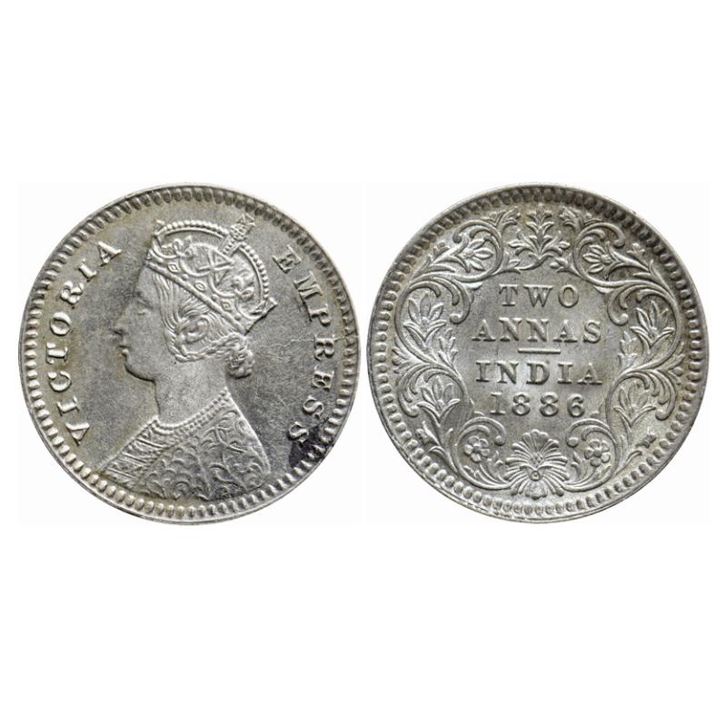 Victoria Empress, Silver, 2 Annas, 1886, Calcutta Mint, B/II, 'C' incused, Die crack on obv. GK 782. Extremely Fine. Scarce.