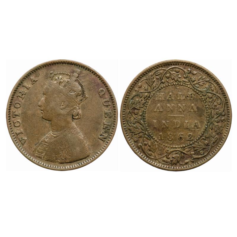 Victoria Queen, Copper, Half Anna, 1862, Bombay Mint, A/I, Smuged Type flowers. GK 392. Very Fine. Scarce.