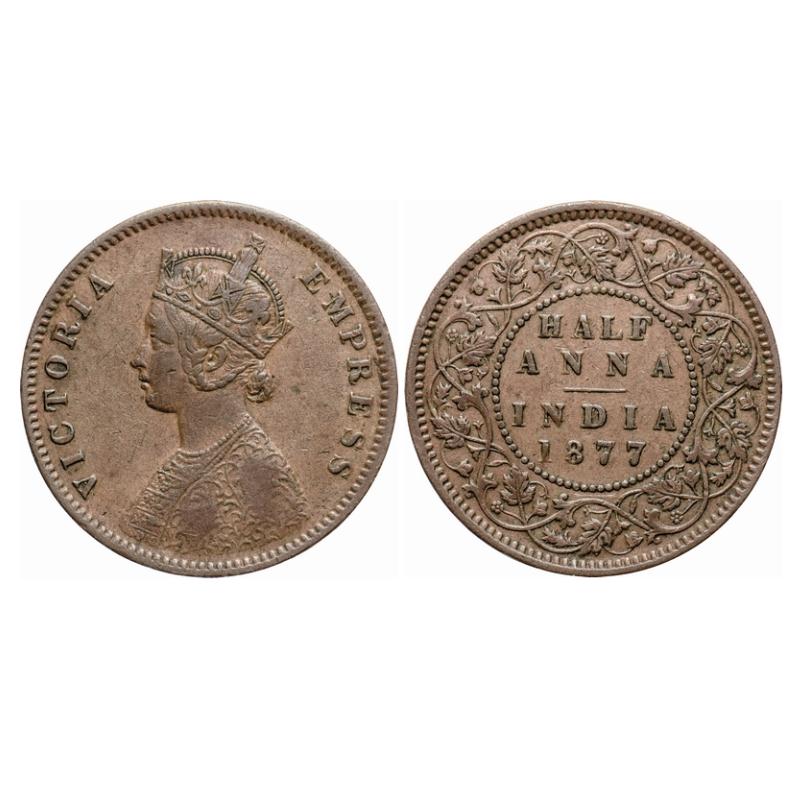 Victoria Empress, Copper, Half Anna, 1877, Calcutta Mint, C/II, Numeral '77' broad. GK 821. Very Fine+. Scarce.