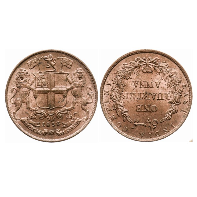 Victoria Queen, Copper, Quarter Anna, 1858, J. Watt & Co. Birmingham Mint, Single leaf, Year numera...