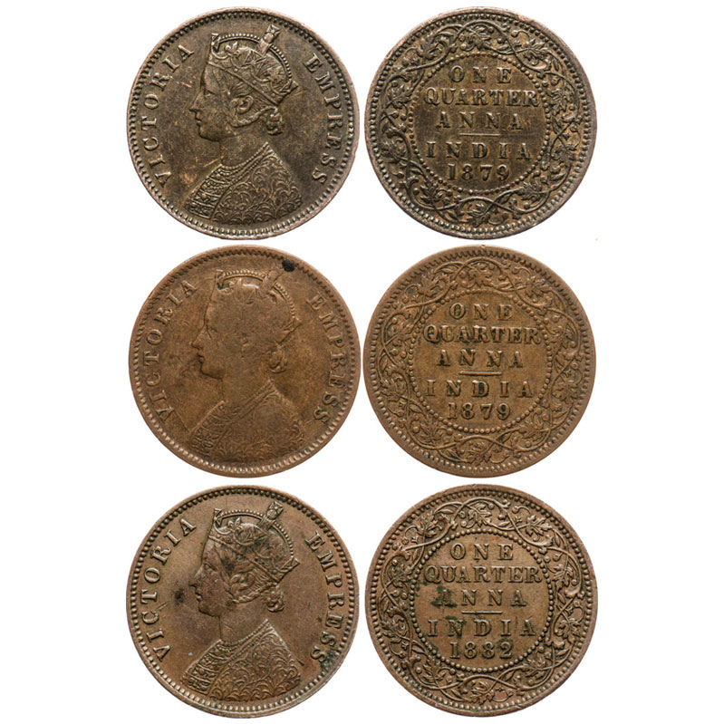 | Victoria Empress, Copper, Quarter Anna (3 coins), 1879(2), 1882, Calcutta Mint, B/II, 'C' incused. GK 831, 835. Very Fine to very Fine+. Scarce. |