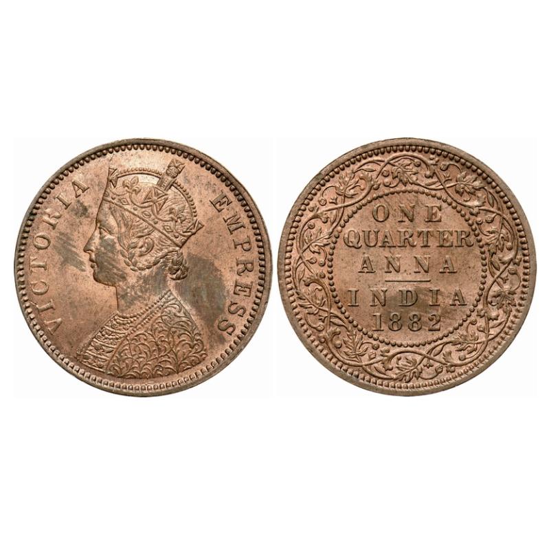 Victoria Empress, Copper, Quarter Anna, 1882, Calcutta Mint, B/II, 'C' incused. GK 835. Uncirculated, Details. Very Scarce.