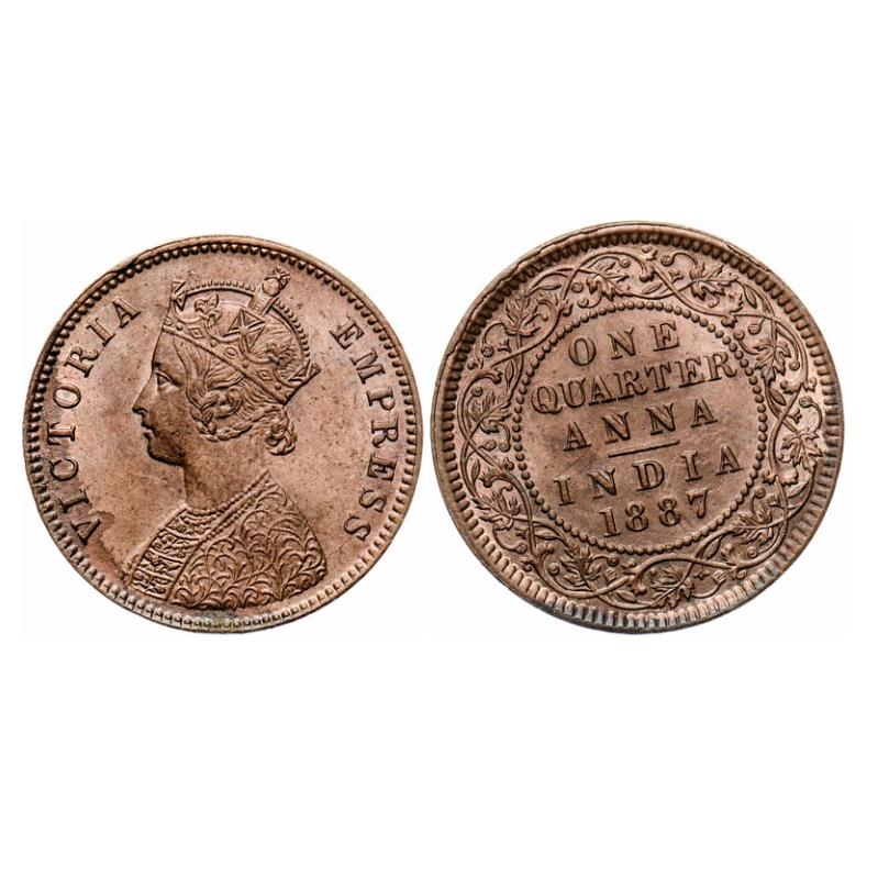 Victoria Empress, Copper, Quarter Anna, 1887, Calcutta Mint, B/II, 'C' incused, Ghost on rev. GK 844. Uncirculated. Rare.