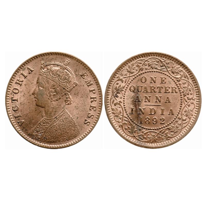Victoria Empress, Copper, Quarter Anna, 1892, Calcutta Mint, B/II, No mint mark, Multiple die cracks on obv. GK 851. Uncirculated Details. Scarce.