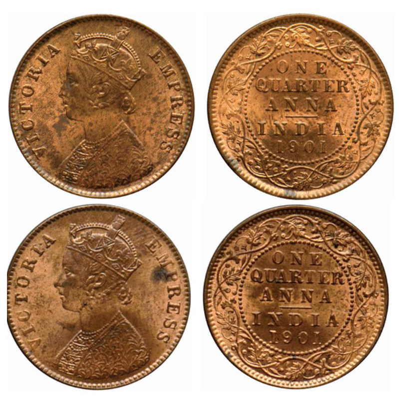 Victoria Empress, Copper, Quarter Anna (2 coins), 1901, Calcutta Mint, B/II, No mint mark. GK 860. Uncirculated details, Scarce.