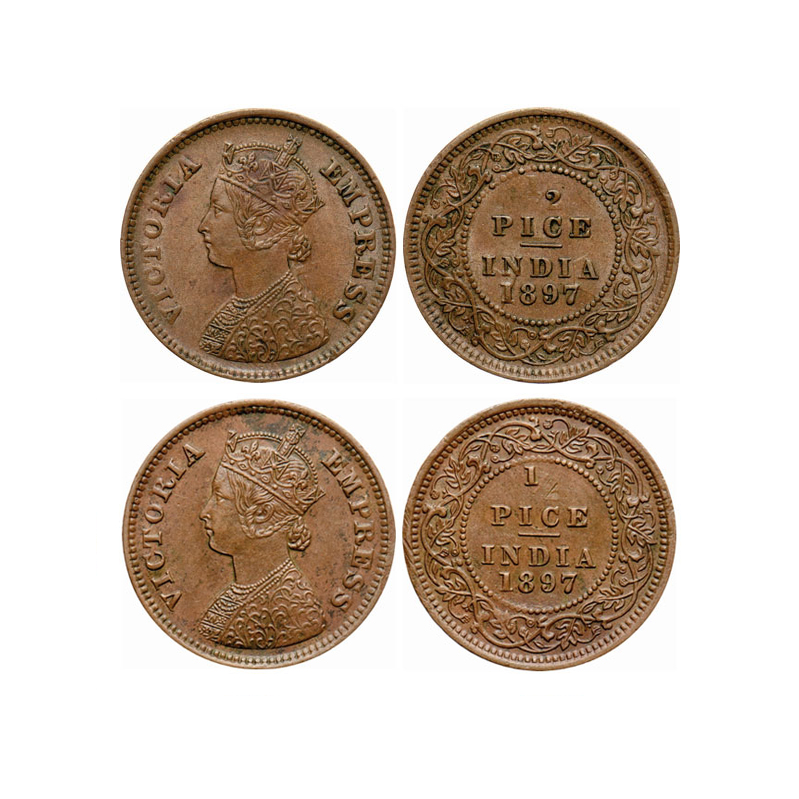 Victoria Empress, Copper, 1/2 Pice (2 coins), 1897, Calcutta Mint, A/I, No mint mark. Error numeral 1 of 1/2 and numeral 2 of 1/2 are die filled. GK 877. Extremely Fine+. Rare.