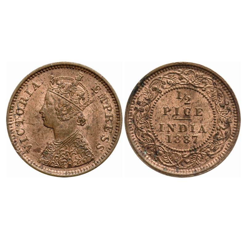 | Victoria Empress, Copper, 1/2 Pice, 1887, Calcutta Mint, A/I, No mint mark, Ghost on rev, Multiple die cracks on rev. GK 867. About Uncirculated Details. Scarce. |