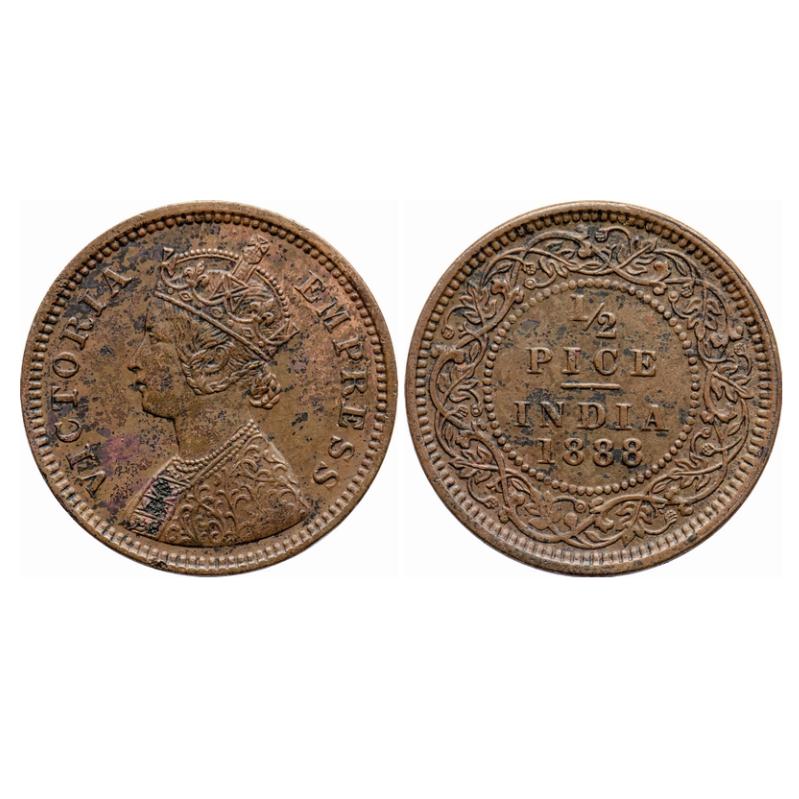 Victoria Empress, Copper, 1/2 Pice, 1888, Calcutta Mint, A/I, No mint mark. GK 868. Extremely Fine+ Details. Rare.