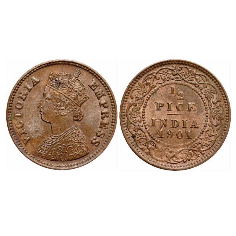 Victoria Empress, Copper, 1/2 Pice, 1901, Calcutta Mint, A/I, No mint mark. GK 881. Uncirculated. Rare.