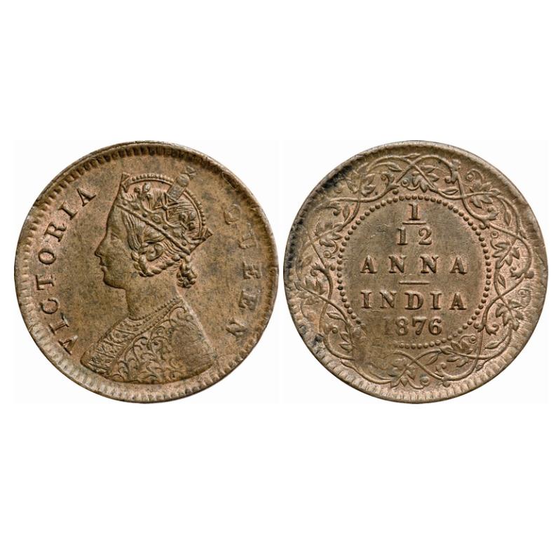 Victoria Queen, Copper, 1/12 Anna, 1876, Calcutta Mint, Obv 'A', No mint mark. GK 888. Extremely Fine+. Very Scarce.